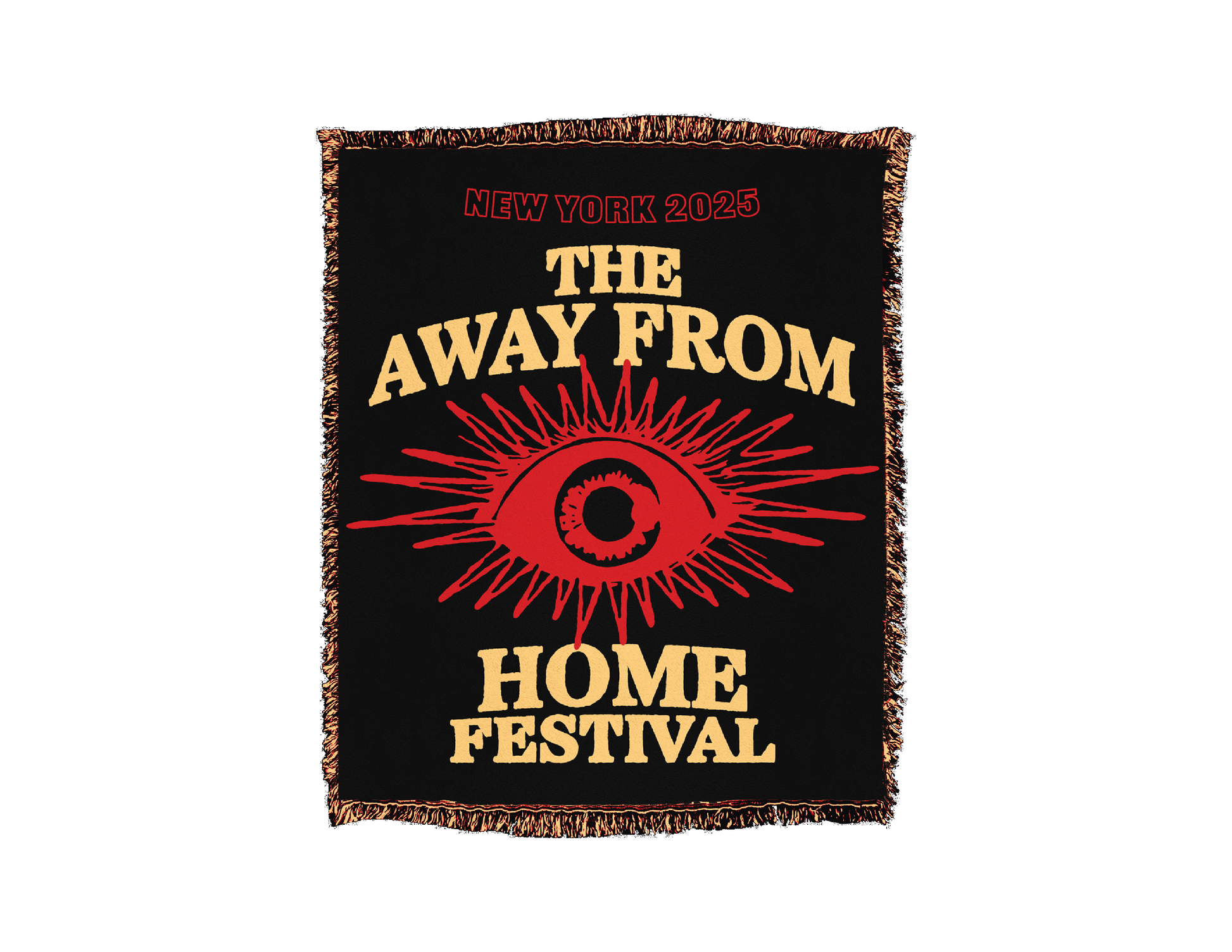 The Away From Home Festival 2025 event blanket with red eye graphic on a heavy duty woven blanket. Finished with a tassel edge for sleek design. Size: 54" x 72".